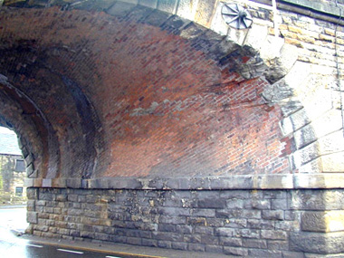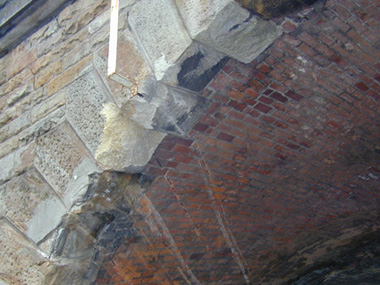 - Vehicle impact damage to the barrel and stonework voussoirs on the spandrel walls.